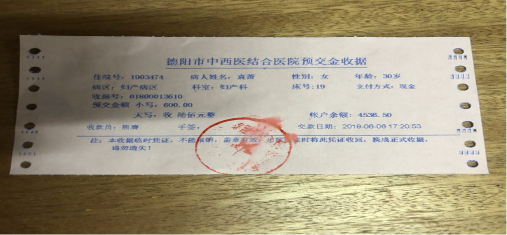 2019年6月6日下午,在我院的住院缴费窗口,妇产科的护士长张小玲正在为患者缴纳住院押金,收据单上显示预交金额为600元,这是怎么一回事呢?